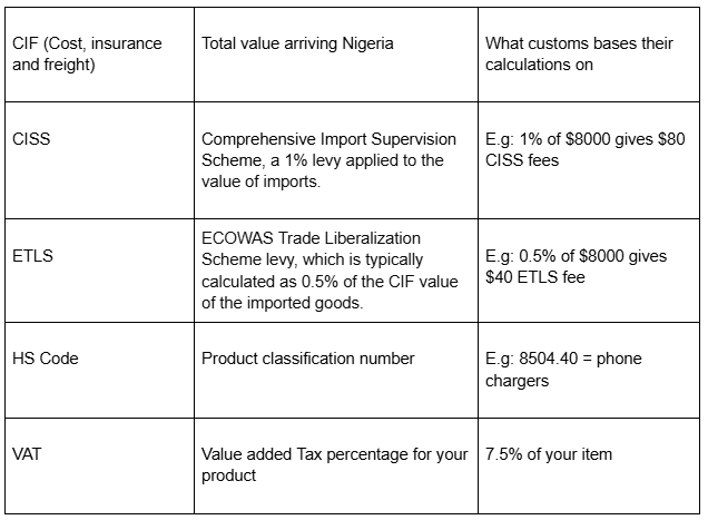 Ignoring VAT: VAT is 7.5% on top of your total. Not on product cost. On CIF + all duties combined. It can be a massive extra cost if you calculate it wrongly.