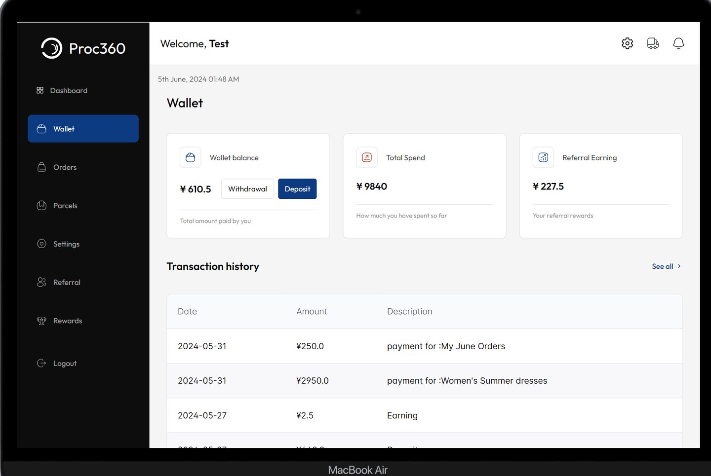 Referral Earnings: Proc360 rewards you for referring friends and colleagues. This section displays the total amount you've earned through successful referrals.