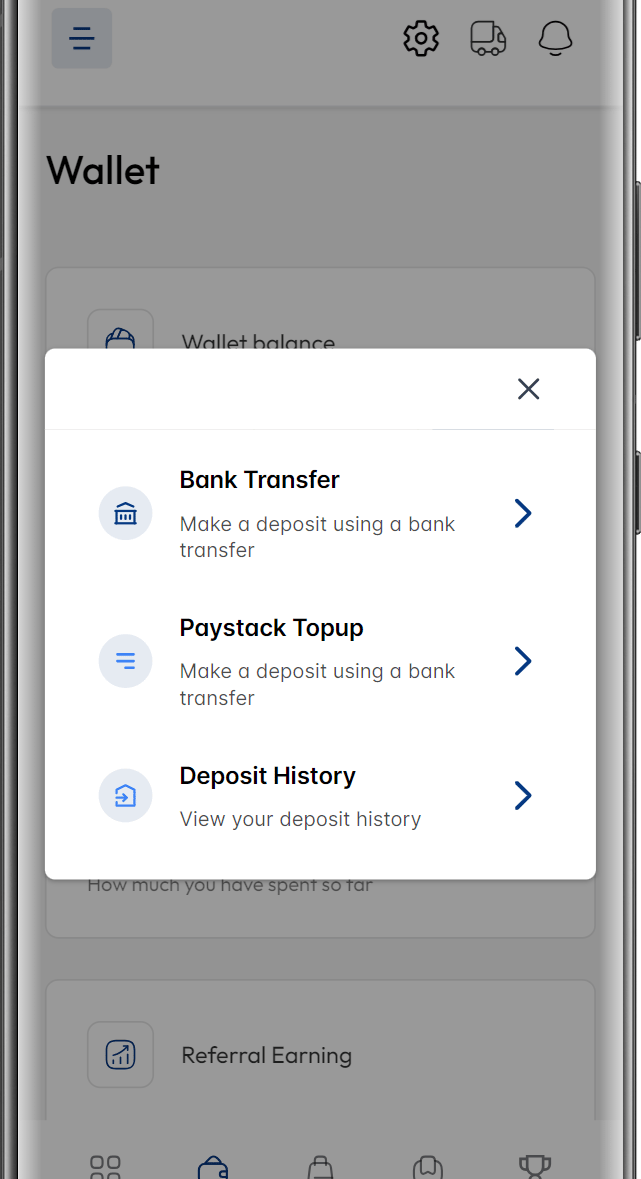 To fund your wallet, click on 'Wallet' from the menu at the bottom of the screen of your proc360 App.