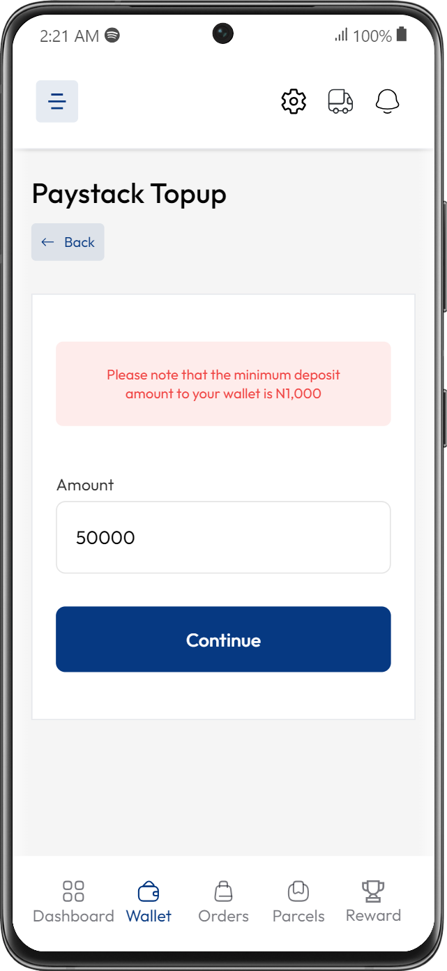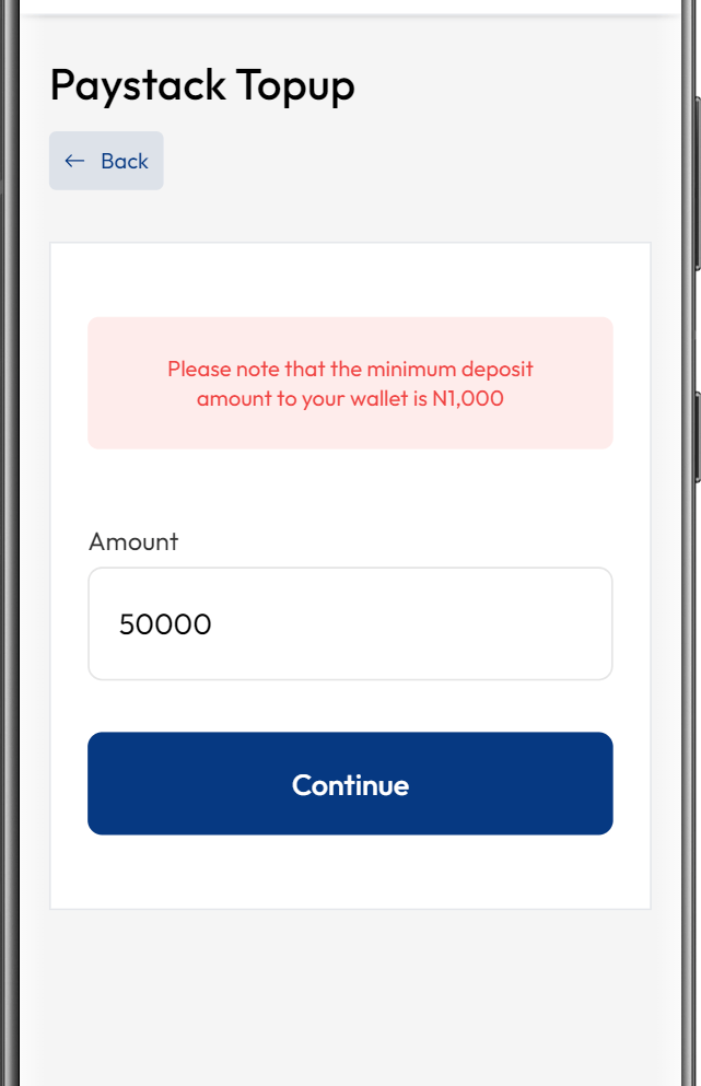 Enter Deposit Amount: Specify the amount you want to deposit into your Proc360 wallet and click continue. Please note that Paystack only supports payments in naira.