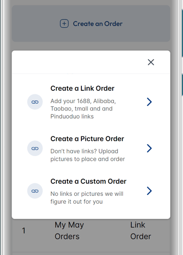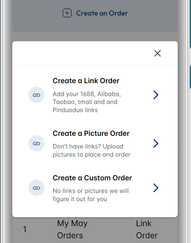 Clicking "Create Order" will lead you to a new screen where you can choose your preferred method for placing an order: Picture Order, Link Order, or Custom Order.