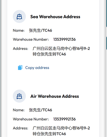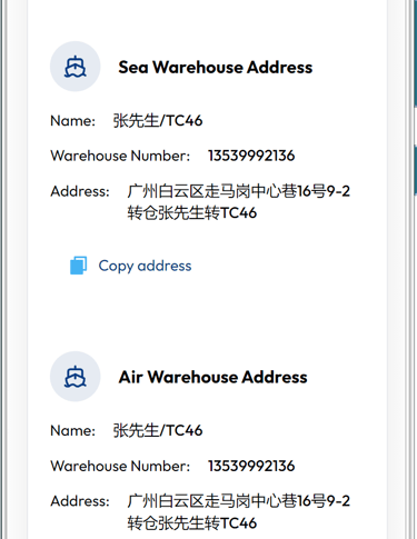 The displayed address is yours to copy and share with your suppliers in China. Use the ‘copy address” button to copy the address exactly as it is. You want to avoid errors caused by manual copying.